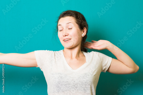 Cheerful girl is stretching her arms after sleeping. She closed her eyes happily and smiling.