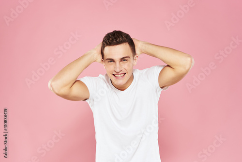 Cheerful handsome man in white t-shirt emotions pink isolated background
