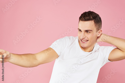 Cheerful handsome man in white t-shirt emotions pink isolated background