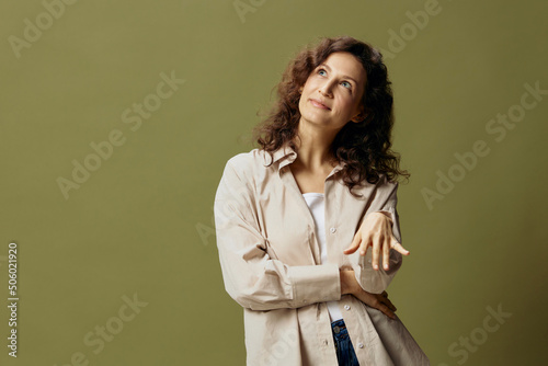Cheerful happy enjoyed curly beautiful female in linen casual shirt pulls hand on camera for a ring posing isolated on over olive green pastel background. People Lifestyle Emotions. Copy space