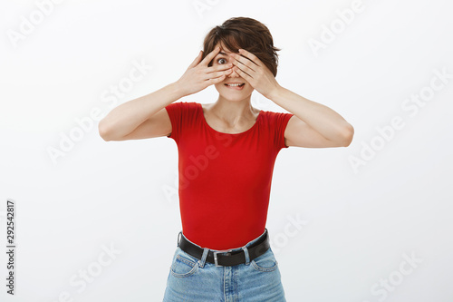 Cheerful intrigued silly tempting female student celebrating b-day close eyes awaiting surprise gift peeking through fingers smiling awkward amused standing white background interested curiously