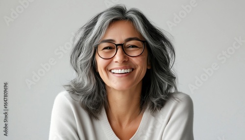 Cheerful Latin Lady In Casual Attire Laughing Against Grey Background, Exuding Success And Happiness With Toothy Smile Directed At Camera.