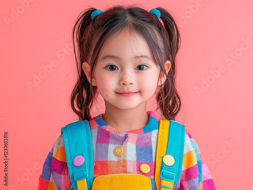 Cheerful Little Asian Girl with a Bright Smile Wearing Colorful Backpack and Stylish Outfit Against a Vibrant Pink Background