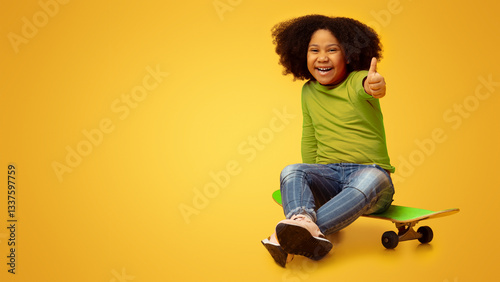 Cheerful little black girl sitting on skateboard and showing thumb up at camera, posing over yellow studio background with free space