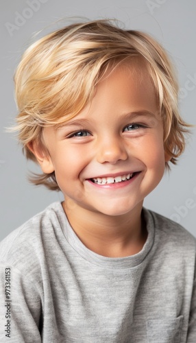 Cheerful little blonde boy with a bright smile, looking directly at the camera against a neutral