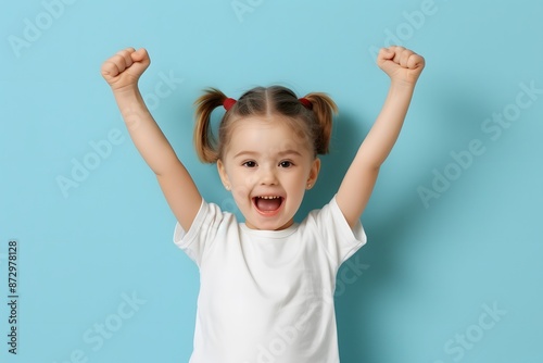 Cheerful little girl with pigtails celebrates joyfully against a bright blue background.