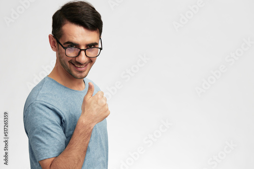Cheerful man blue glasses casual wear posing emotions isolated background