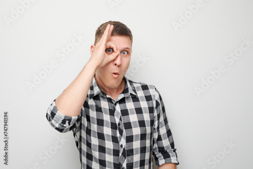 Cheerful man in checkered shirt making OK gesture over eye, smiling at camera on white background