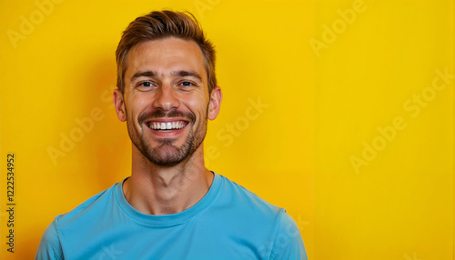 Cheerful man smiling brightly, standing against a vibrant yellow backdrop.