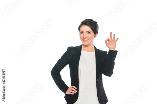 cheerful mixed race businesswoman showing ok gesture isolated on white