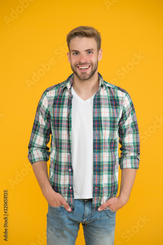 Cheerful mood. Menswear and fashionable clothing. Man looks handsome in casual style. Guy with bristle wear casual outfit. Handsome man. Masculinity concept. Daily outfit. Man model clothes shop