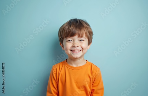 Cheerful portrait of young boy smiles. Child wearing orange t-shirt poses against light blue background. Happy kid with joyful expression. Childhood happiness concept, copy space.