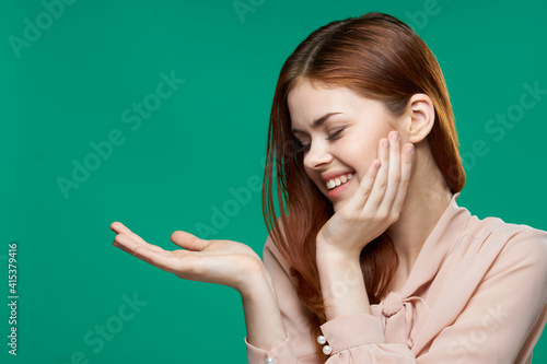 cheerful pretty woman in a pink shirt holds her hand in front of her emotions Green background