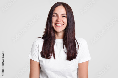 Cheerful satisfied brunette lady has toothy smile, being in good mood, dressed in casual t shirt, expresses positive emotions, isolated over white background. People and facial expressions concept