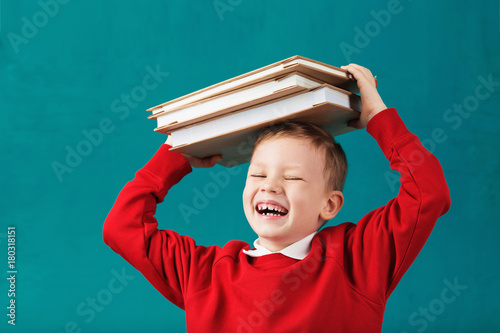 Cheerful smiling little school boy with big books on his head having fun against turquoise wall