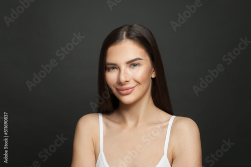 Cheerful smiling woman with clean healthy skin and dark hair on black background