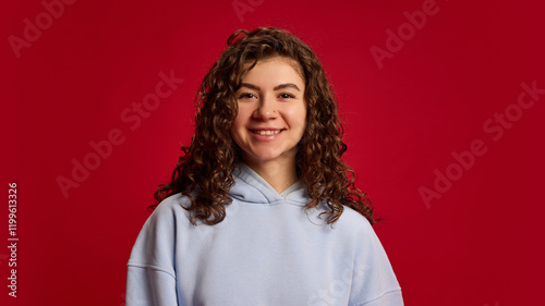 Cheerful smiling young beautiful woman with brunette, curly hairstyle, dressed blue hoodie, showing positive against vibrant red background. Concept of human emotions, beauty, fashion and style.