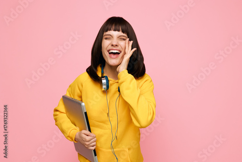 Cheerful student in a bright yellow hoodie smiles while holding a tablet and headphones against a soft pink background, ready for creative learning or music moments.