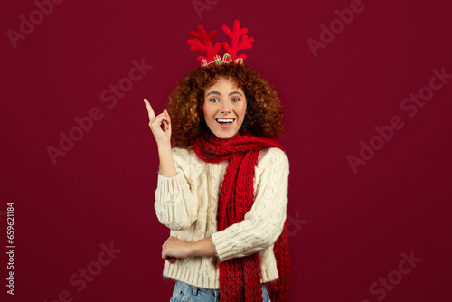 Cheerful teen lady with deer antlers festive spirit of Christmas and New Year