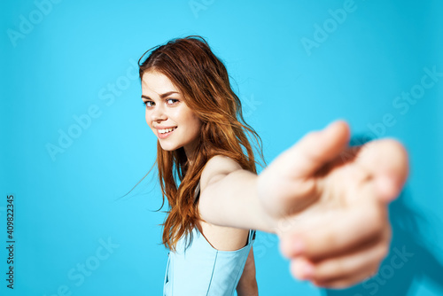 cheerful woman dress gesturing with hands glamor cropped view blue isolated background