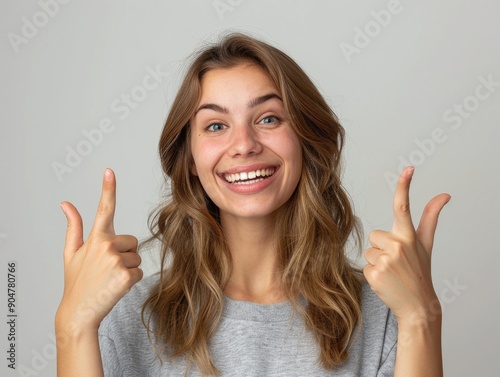 Cheerful Woman Giving Double Thumbs Up, Happy and Confident, Smiling with Positive Energy in Casual Gray Shirt