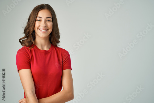 cheerful woman in red t-shirt fashion glamor lifestyle light background