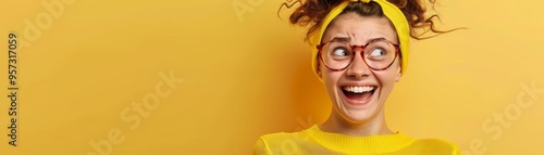 Cheerful woman in yellow outfit and red glasses, smiling happily against vibrant yellow background, free space for text.