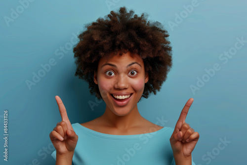 Cheerful Woman Pointing to Blank Space for Advertisement, Isolated on Blue Background