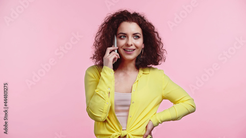 cheerful woman standing with hand on hip while talking on cellphone isolated on pink