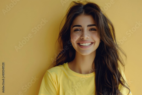 Cheerful woman with long hair and a bright yellow top, beaming with happiness against a yellow wall
