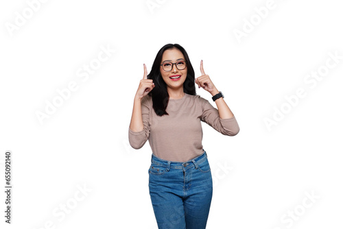 Cheerful Young Asian Woman Pointing Isolated Background