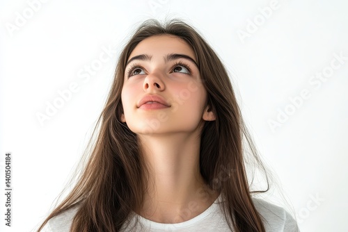 Cheerful Young Brunette Woman Gazing Upwards Against a Bright White Backdrop in Studio Setting