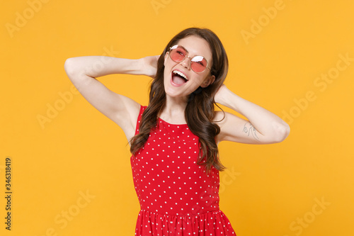 Cheerful young brunette woman girl in red summer dress, eyeglasses posing isolated on yellow background in studio. People lifestyle concept. Mock up copy space. Hold hands behind head, looking aside.