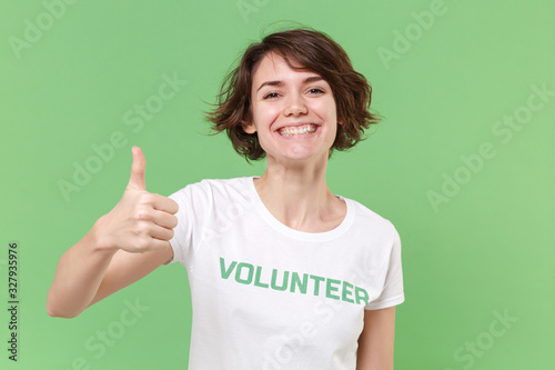 Cheerful young brunette woman in white volunteer t-shirt isolated on pastel green wall background studio portrait. Voluntary free work assistance help charity grace teamwork concept. Showing thumb up.