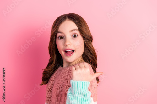 Cheerful young girl in stylish sweater with vibrant expressions against a pink background, showcasing youthful charm