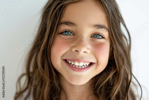 Cheerful young girl with freckles smiling on white background. Childhood innocence.