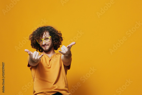 Cheerful young man with curly hair in yellow glasses on a vibrant orange background, expressing joy and positivity while wearing a casual shirt