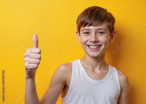 Cheerful Young Person with Enthusiastic Thumbs Up Against Bright Yellow Background