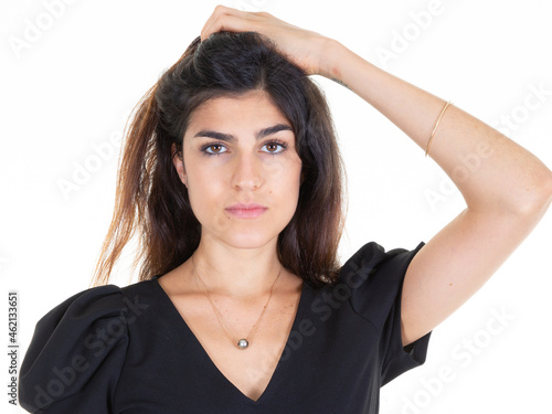 cheerful young pretty woman brunette long brown hair smiling hand on hairs on white background