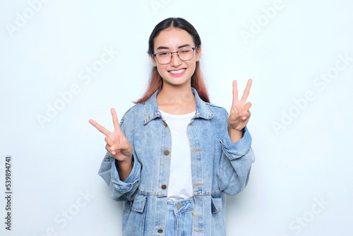 Cheerful young pretty woman showing peace gesture isolated on white background