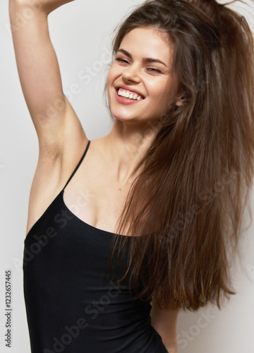 Cheerful young woman in a black swimsuit, smiling and playing with her hair, against a light neutral background. Joy and confidence concept.