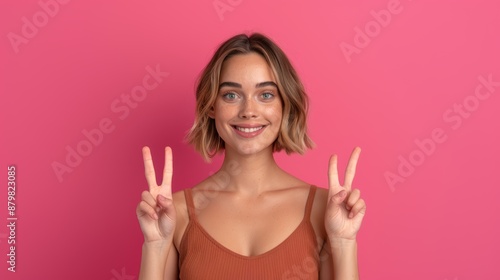 Cheerful young woman in a singlet showing peace signs, isolated on a vibrant pink background, high resolution, minimalistic style, focus cover all object