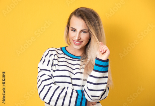 Cheerful young woman, isolated on yellow background. Playful good-mood girl posing. Copy space