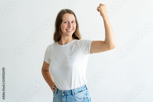 Cheerful young woman pumping fist and celebrating achievement. Pretty girl looking at camera. Achievement concept. Isolated front view on white background.
