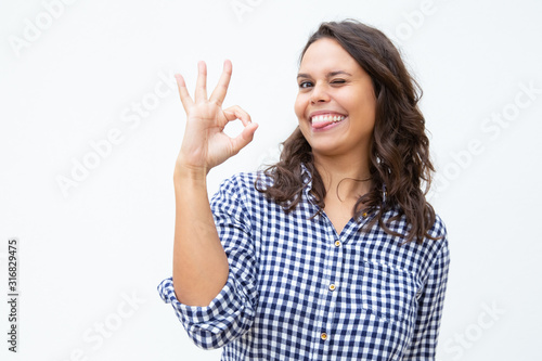 Cheerful young woman showing ok sign. Attractive happy young woman with tongue out winking at camera on white background. Approvement concept