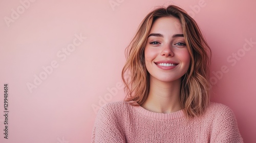 Cheerful Young Woman Smiling Against a Soft Pink Background in Cozy Sweater