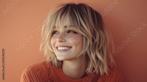 Cheerful Young Woman Smiling Against Orange Background With Stylish Hair