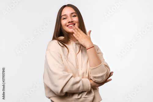 Cheerful young woman with long chestnut hair, standing pleased expression and pleasure. Facial expression concept