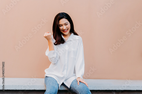 Cheering young Asian girl holding her fists tight like winning big prize, sitting on concrete bench with desert sand colored wall in background wearing casual white shirt and jeans clothing