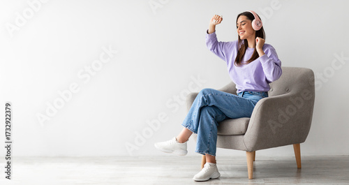 Cheery young lady in headphones listening to music and dancing while sitting in armchair against white studio wall, banner design with free space. Carefree Caucasian woman moving to favorite song